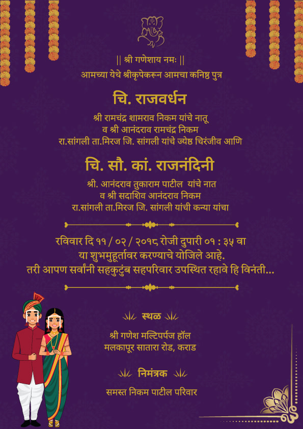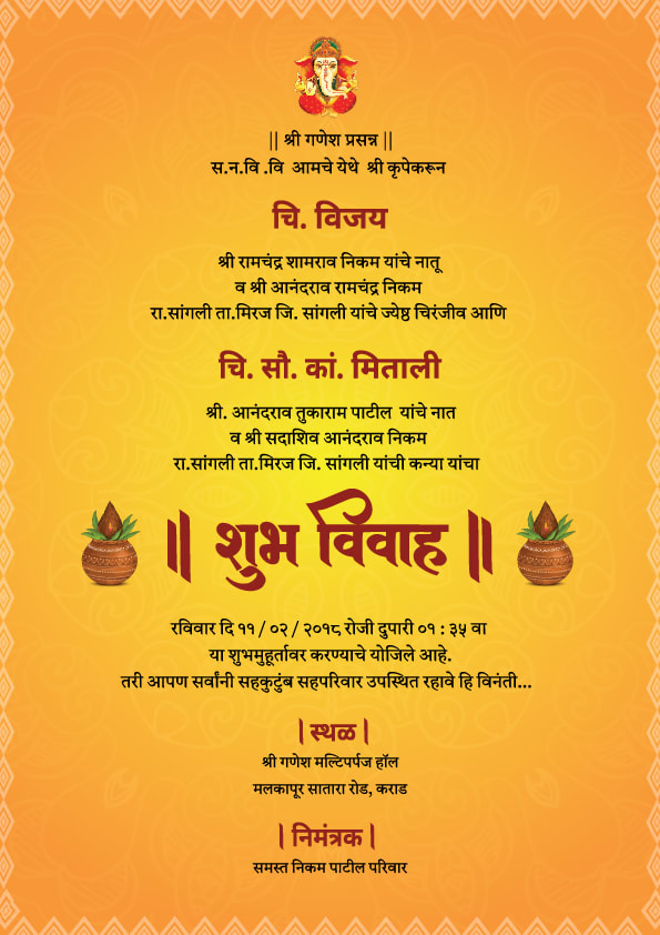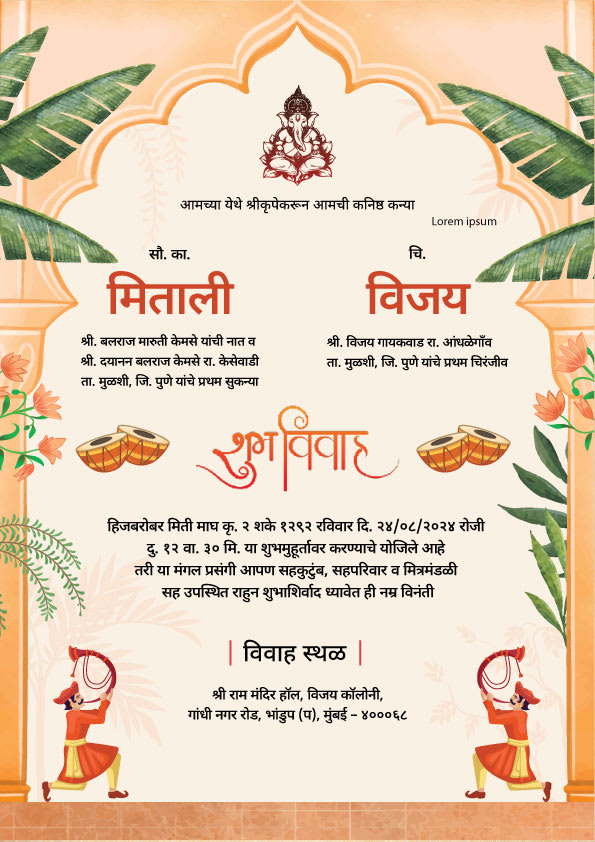 आपल्या खास दिवसाला पारंपरिक आणि आधुनिक रंग देणाऱ्या आमच्या डिजिटल मराठी लग्नपत्रिका. नावे, सोहळ्याचे तपशील व खास संदेश सहज जोडा. कारण प्रत्येक 'मंगलकार्य' ला हवीच एक सुंदर, आकर्षक व आपल्या मनाप्रमाणे सजवलेली आमंत्रणपत्रिका!